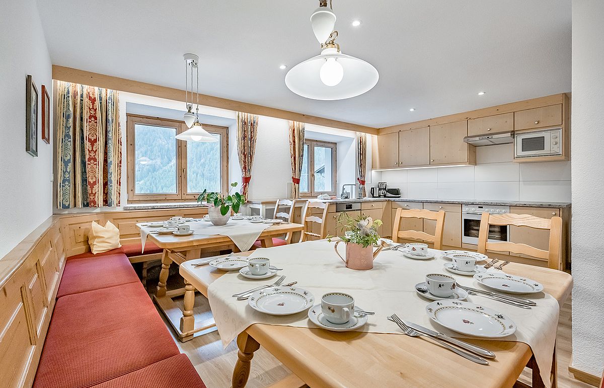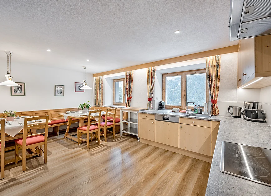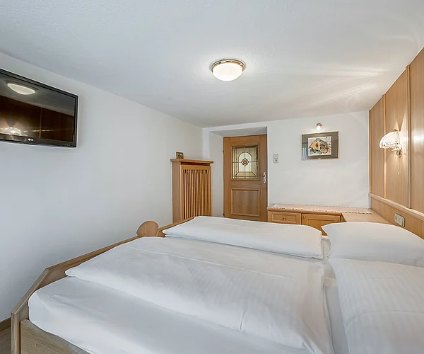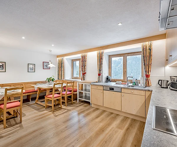 Das Appartement umfasst eine geräumige, voll ausgestattete Küche mit gemütlicher Sitzecke, ein Wohn-/Schlafzimmer mit TV, ein Schlafzimmer mit Doppelbett und TV, einen Vorraum mit Garderobe sowie ein Badezimmer mit Dusche und WC.
